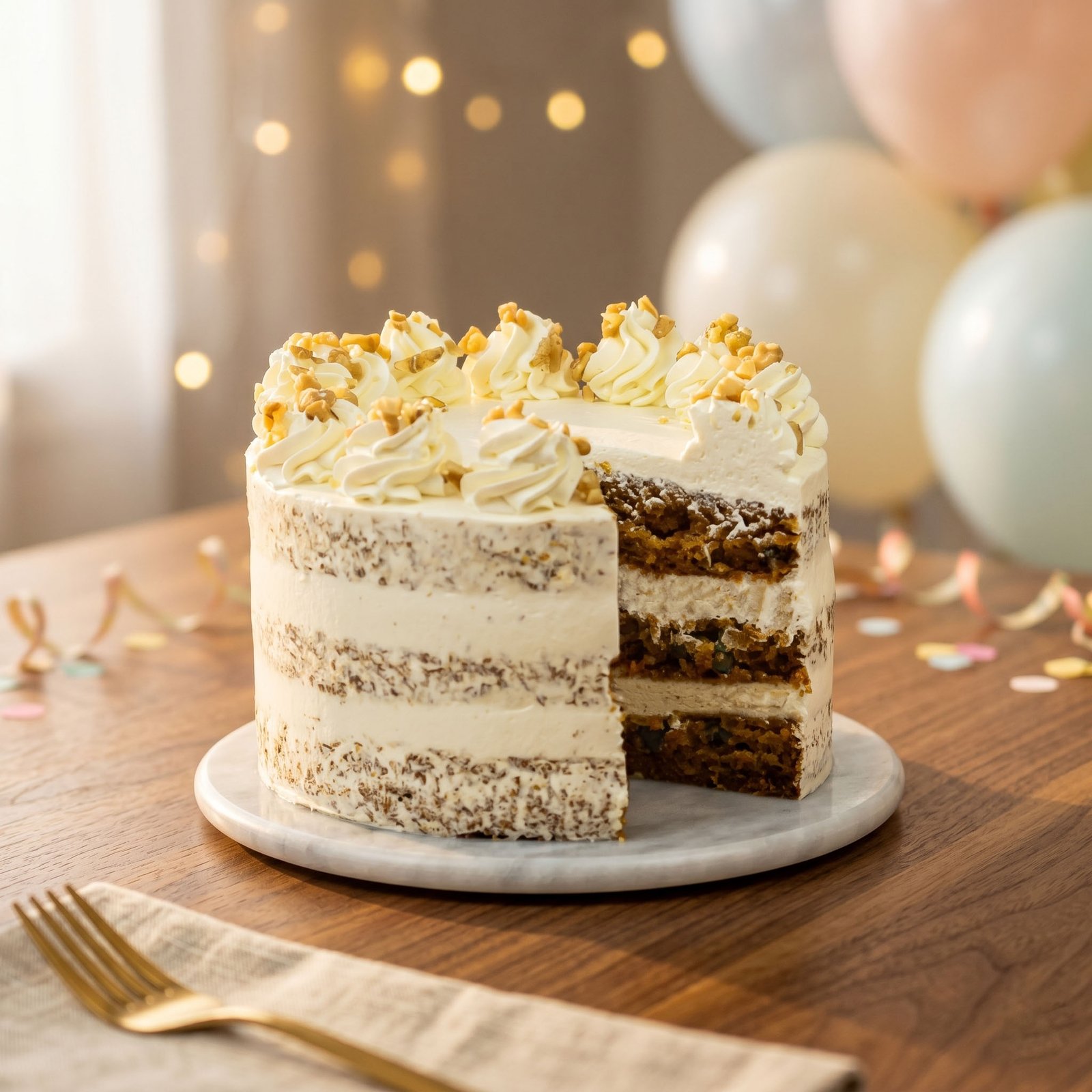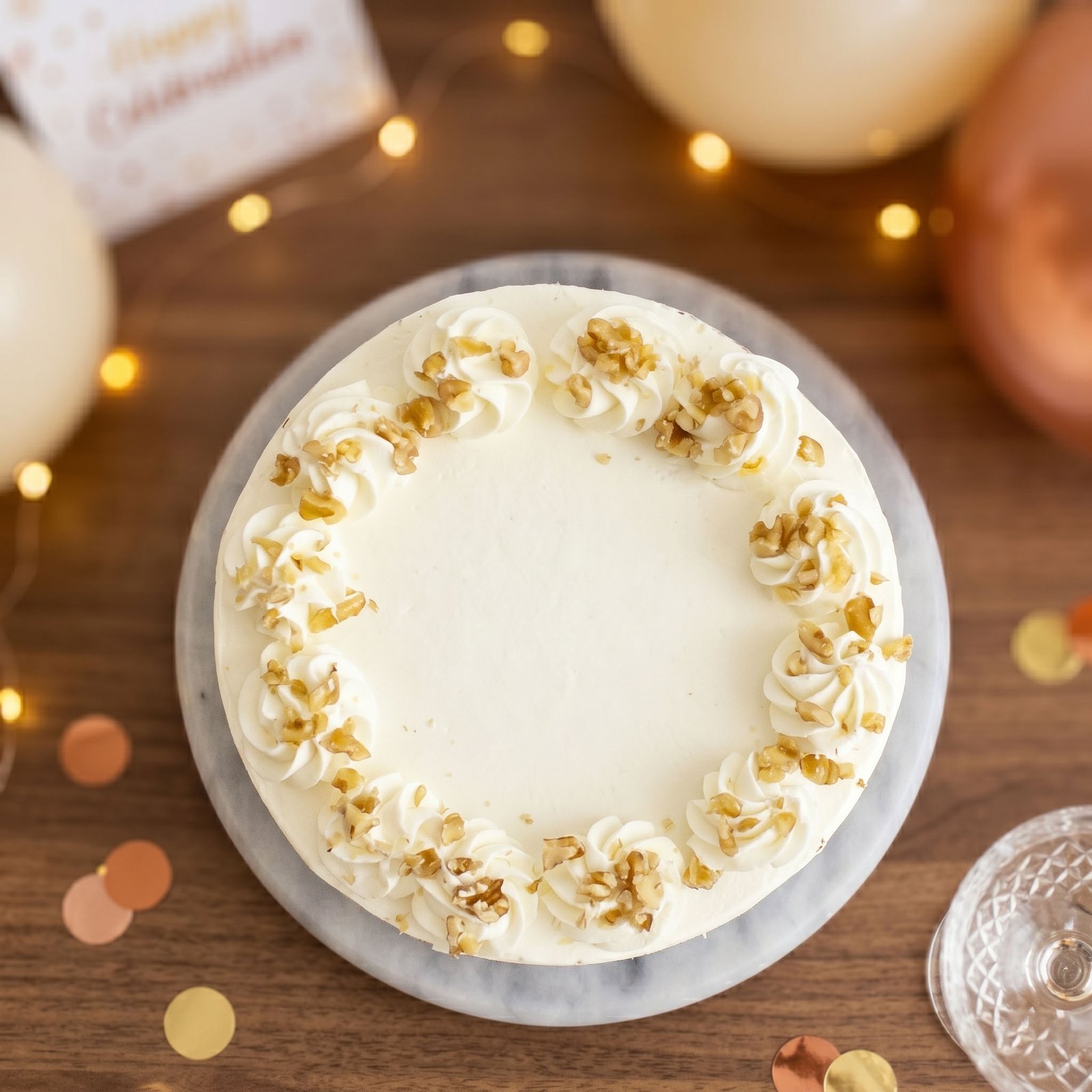 un contraste ácido con los sabores dulces y especiados. Su exterior está perfectamente terminado con la crema de queso y adornado con nueces picadas, que añaden tanto textura como un estallido de sabor. ¡Un verdadero deleite para los sentidos!