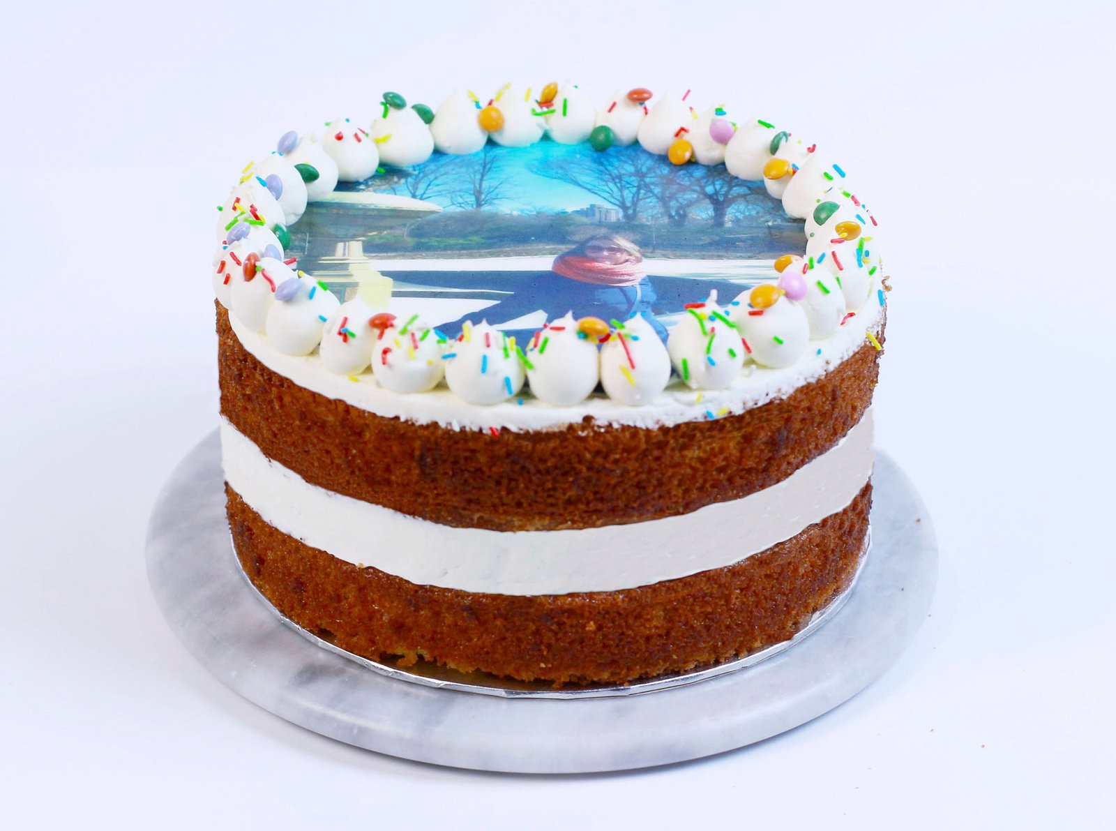¡Tu cara (o cualquier imagen que desees) en un pastel! Nuestra TARTA FOTO, una de nuestras opciones más destacadas de pasteles personalizados, te permite añadir un toque personal a tu celebración. Elige entre un esponjoso pastel de chocolate, Red Velvet, vainilla o Lotus vegana, todo cubierto con una imagen comestible de tu elección. Cada pastel se crea con el sabor que tu prefieras y se culmina con una bonita imagen impresa en pasta de azúcar, haciéndolo verdaderamente especial. ¡Perfecto para cualquier ocasión!